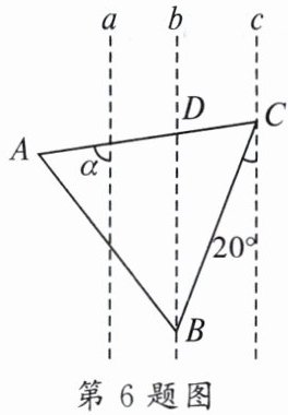 6. 如图,直线$a// b// c$,等边三角形$ABC的顶点B$,$C分别在直线c和b$上,边$BC与直线c所夹的锐角为20^{\circ}$,则$\angle\alpha$的度数为(