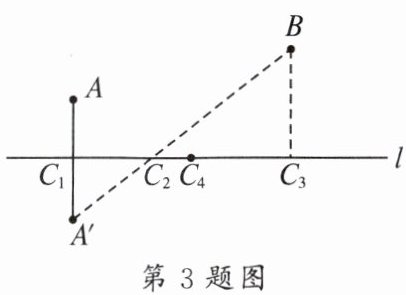 3. 某社区准备在街道(直线$l$)旁修建一个牛奶站,向居民区$A$,$B$提供牛奶。如图,已知点$A关于直线l的对称点为A'$,$AA'与直线l相交于点C_1$,$A'B与直线l相交于点C_2$,$BC_3\perp l于点C_3$,$C_4是C_1C_3$的中点,为了能使居民区$A$,$B$到牛奶站的距离之和最短,则牛奶站应建在的地方为(