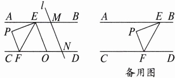 18. 如图,直线$AB// CD$,点 E 在直线 AB 上,点 F 在直线 CD 上,点 P 在直线 AB,CD 之间,连接 PE,PF,EF,$∠PFE= 50^{\circ }$,直线 l 与直线 AB,CD 分别交于点 M,N,$∠MNC= α(0^{\circ }<α<90^{\circ })$,EO 是$∠MEF$的平分线,交直线 CD 于点 O。