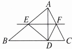 17. 如图,AD是$△ABC$的高线,AD的垂直平分线分别交AB,AC于点E,F,连接DE,DF。