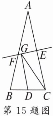 15. 如图,等腰三角形 ABC 的底边 BC 的长为 4,面积是 18,腰 AC 的垂直平分线 EF 分别交 AC,AB 于点 E,F。若点 D 为 BC 边的中点,点 G 为线段 EF 上一动点,则$△CDG$周长的最小值为