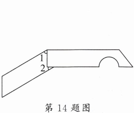 14. 如图所示的是我们生活中能经常接触到的小刀的示意图,刀柄是一个直角梯形(挖去一个半圆),刀片上下是平行的,转动刀片时会形成$∠1$、$∠2$,则$∠1+∠2= $