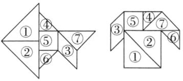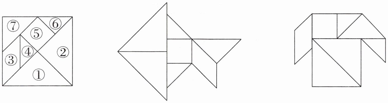 3. 下面图形中的各部分分别是用七巧板中的哪一块拼成的?请你用序号标出来。