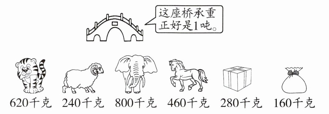 已知桥限重$1t = 1000kg$,大象重$400kg$,小熊重$400kg$,小牛重$500kg$。