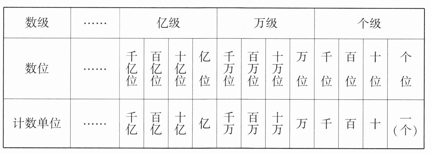 数级分为个级(包括个位、十位、百位、千位)、万级(包括万位、十万位、百万位、千万位)、亿级(包括亿位、十亿位、百亿位、千亿位)等,每$4$个数位为一级。