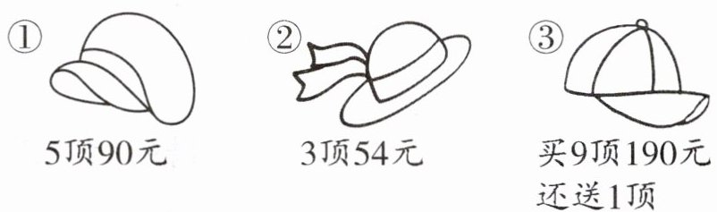 ①$ 90÷5=18 $(元) ②$ 54÷3=18 $(元) ③$ 190÷(9+1)=19 $(元) ③号帽子最贵