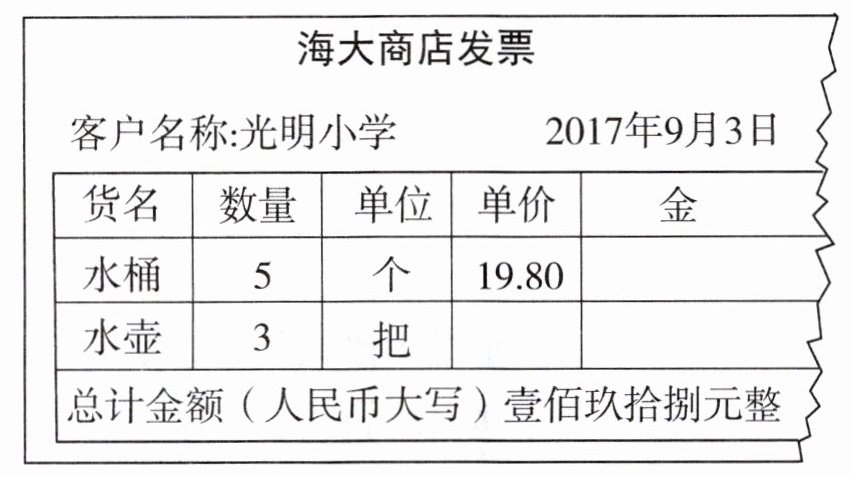 8. 新学期,刘老师为学校购置办公用品,不小心把购物发票撕去了一角。你帮她算一算,每把水壶的价钱是(