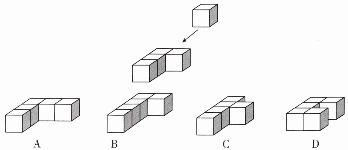 7. 给下面的图形再添一块,从正面和右面看,形状都没有发生变化的是(