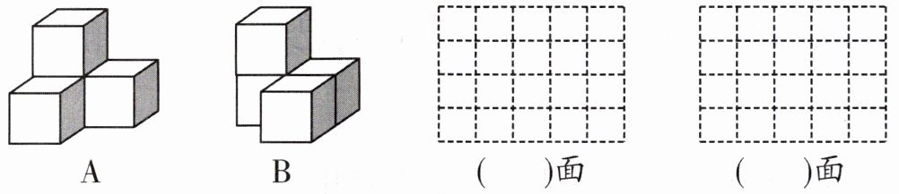 从上面、正面、右面分别看立体图形A和B,如果在某一方向看到的图形都是完全相同的,那么请你将从这个方向看到的图形平面图在方格中画出来。