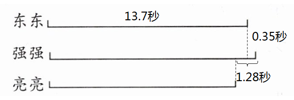 1. 同学们进行百米赛跑。东东跑了 13.7 秒,强强比东东多用 0.35 秒,亮亮比强强少用 1.28 秒。亮亮用了多少秒?请把下图补充完整再计算。