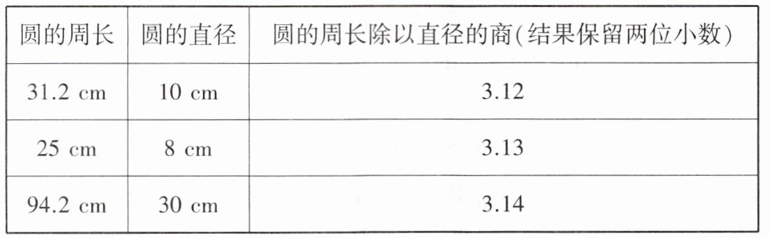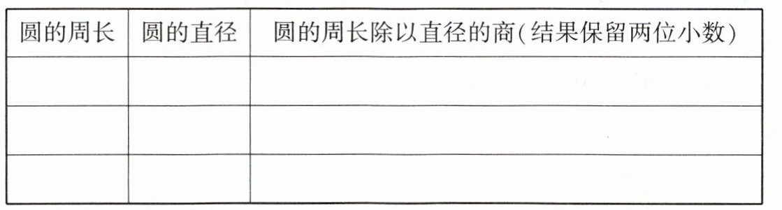 先用滚动、绕线等方法测量出直径不同的圆片的周长,然后测量出圆片的直径,并利用测量得到的数据,计算出每个圆片的周长除以直径的商,最后填表(所得数据以编者测量的值为准)。