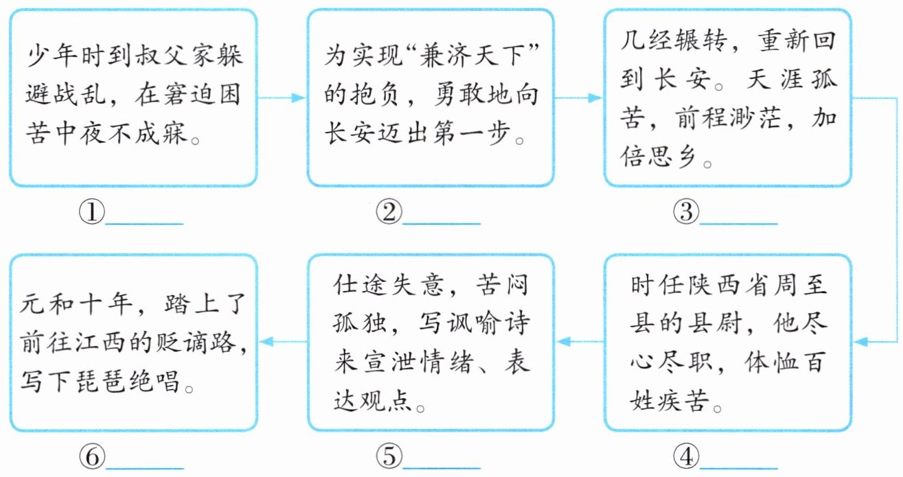1. 白居易一生辗转,创作不止。以下是他的生平经历,请你根据提示,选择不同时期对应的诗句。