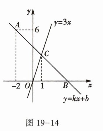 7. 如图19-14,在平面直角坐标系中,一次函数$y = kx + b的图象经过点A( - 2,6)$,且与$x轴相交于点B$,与正比例函数$y = 3x的图象相交于点C$,点$C的横坐标为1$.