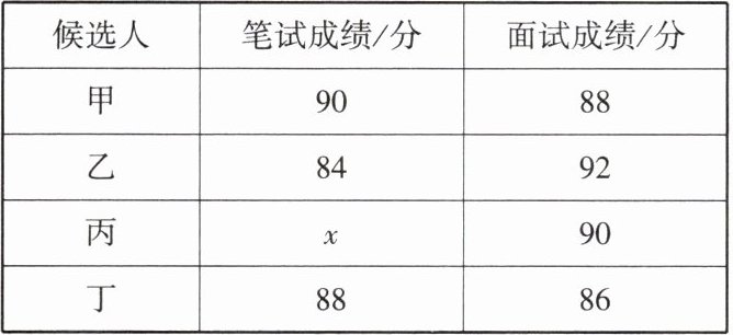 (2) 现得知候选人丙的综合成绩为87.6分,求表中x的值;
