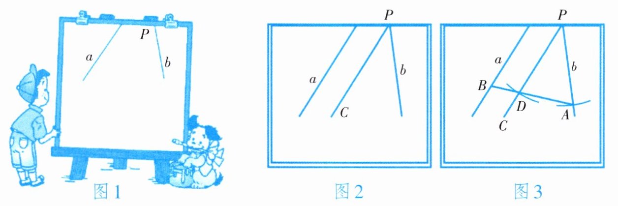 (2)小明在此基础上又进行了如下操作和探究(如图3):①以$P$为圆心,任意长为半径画圆弧,分别交直线$b$,$PC于点A$,$D$;②连结$AD并延长交直线a于点B$,请写出图3中所有与$∠PAB$相等的角,并说明理由.(提示:题目解答涉及等腰三角形的性质,请参阅浙教版《数学》教材八年级上册相关内容)