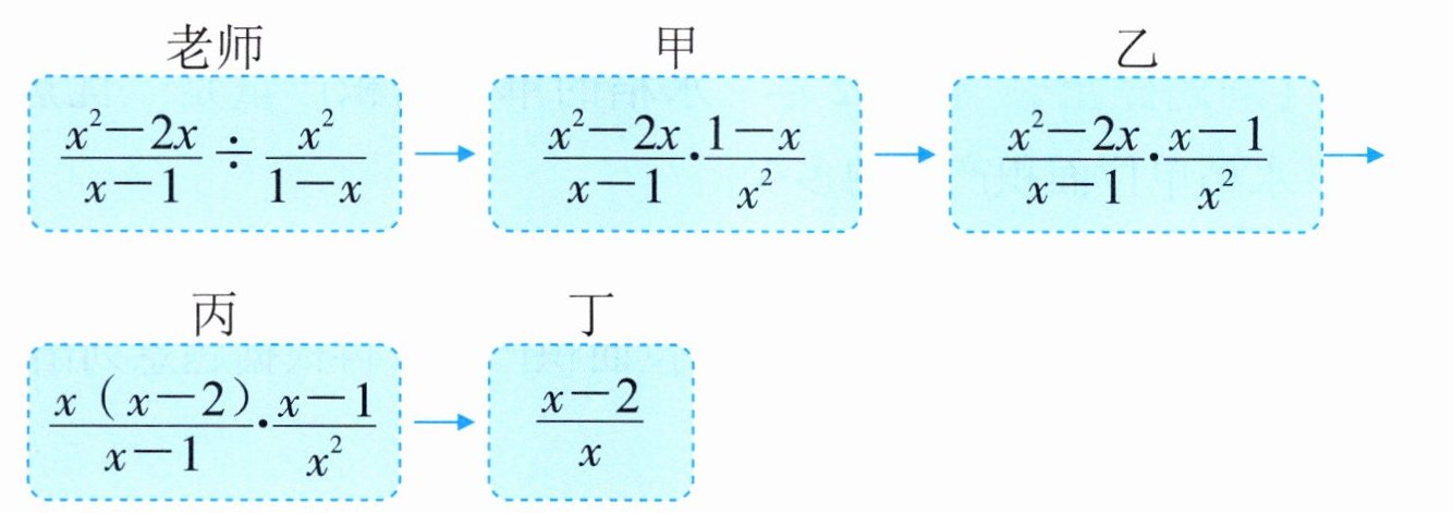 4. 老师设计了接力游戏,甲、乙、丙、丁四位同学用合作的方式完成分式化简,规则是:每人只能看到前一人给的式子,并进行一步计算,再将结果传递给下一人,最后完成化简过程如图所示($x\neq0,1$)。接力中,自己负责的一步出现错误的同学是(