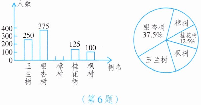 6. 植树节期间,某街道决定从备选的五种树中选购一种进行栽种,为了更好地了解社情民意,工作人员在街道辖区范围内随机抽取了部分居民,进行“我最喜欢的一种树”的调查活动(每人限选其中一种树),并将调查结果整理后,绘制成如图两个不完整的统计图,请根据图中信息解答以下问题: