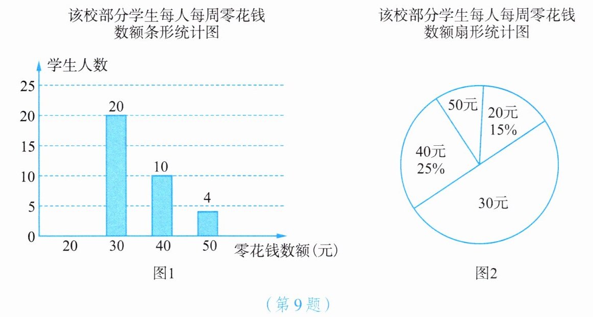 9. 为了解学生零花钱的使用情况,某校团委随机调查了本校部分学生每人每周的零花钱数额,并绘制了如图1、图2所示的两个统计图(部分未完成)。请根据图中信息,回答下列问题: