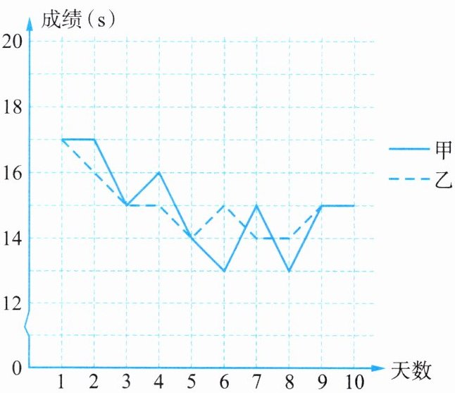 【生活情境】某校欲从甲、乙两名运动员中选出一人参加市中学生运动会100m短跑比赛.教练组织他们进行集训,并把10天的训练成绩用折线统计图进行了记录(如下图所示).去年市运会该项目的第一名成绩为13s.