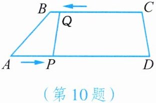 10. 如图,在四边形ABCD中,$AD// BC,BC= 6cm,AD= 9cm$,P,Q分别从点A,C同时出发,点P以1 cm/s的速度由A向D运动,点Q以2 cm/s的速度由C向B运动.