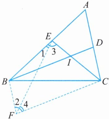 假设△ABC中AB>AC,则∠B<∠C,由于BD,CE是角平分线,则∠EBI<∠DCI。在△BEI与△DCI中,有∠EIB=∠DIC,从而可得∠BEC>∠BDC ①。但是在△BCE与△CBD中,因BD=CE,BC是公共边,所以∠BCE>∠CBD,则BE>CD。作□BFCD,连结EF,由BE>CD=BF,则∠1<∠2。又CE=BD=CF,则∠3=∠4,即∠BEC<∠BFC=∠BDC ②。由此可知①与②矛盾,则AB不大于AC,同理AC不大于AB,故AB=AC。