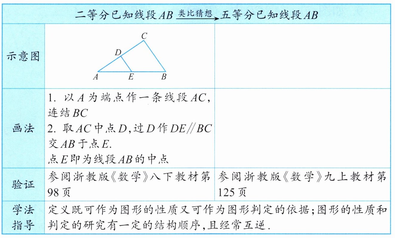 经过三角形一边的中点与另一边平行的直线,必过第三边的中点.通过此方法,我们可以将一条已知线段平分.类比此方法,我们可以将一条已知线段任意等分.请根据表格中的要求完成填空: