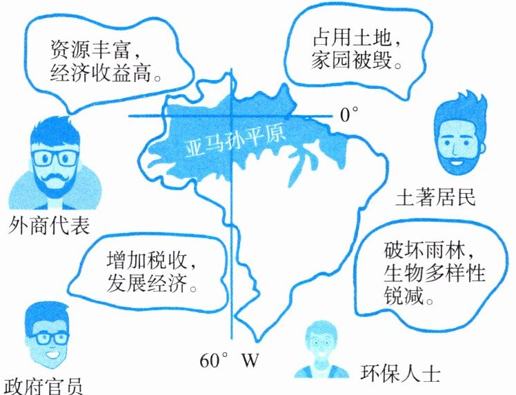 巴西亚马孙平原热带雨林资源丰富。某跨国公司计划投资一个热带雨林开发项目,为此政府召开了听证会。下图体现了参会各方的主要观点。据此回答第7—9题。