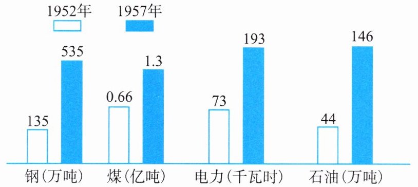 材料三 如图是1952年和1957年我国工业主要产品产量示意图。