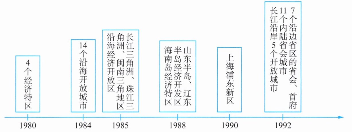 )①率先从东南沿海四个经济特区开始 ②逐步开放到东部沿海及内地连续地带 ③进一步开放到沿江、沿边和内陆省会 ④形成全方位的对外开放格局