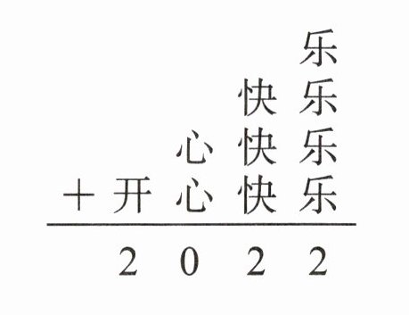 【解析】:根据竖式,四个“乐”字相加的个位数字是2。因为$4×3=12$,$4×8=32$,所以“乐”可能是3或8。若“乐”=8,则个位相加向十位进3;此时十位上三个“快”字相加再加上3,和的个位数字是2,即三个“快”字相加个位数字为$12 - 3=9$,$3×3=9$,则“快”=3,向百位进0。百位上两个“心”字相加,和的个位数字是0,所以“心”=0或5,若“心”=0,向千位进0,千位“开”=2,此时“开”=2,“心”=0,“快”=3,“乐”=8,数字均不同,但计算可得$8 + 38 + 038 + 2038 = 2122\neq2022$,不符合;若“心”=5,向千位进1,千位“开”=1,计算$8 + 38 + 538 + 1538 = 2122\neq2022$,也不符合,所以“乐”=8不成立。