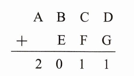 【解析】:观察加法竖式,四位数加三位数的和是2011。从最高位千位看,A在四位数的千位,和的千位是2,因为三位数没有千位,所以A只能是1(若A为2,即使三位数最小为000,和也会是2000以上,但这里和是2011,且A为2时四位数至少2000,三位数至少000,和为2000,而实际和是2011,不过考虑到每个字母代表不同数字,且三位数的百位E不能为0,所以A只能是1,这样四位数是1BCD,加上三位数EFG等于2011,说明千位相加时1加0(三位数无千位)再加上百位可能的进位等于2,所以百位相加有进位1)。