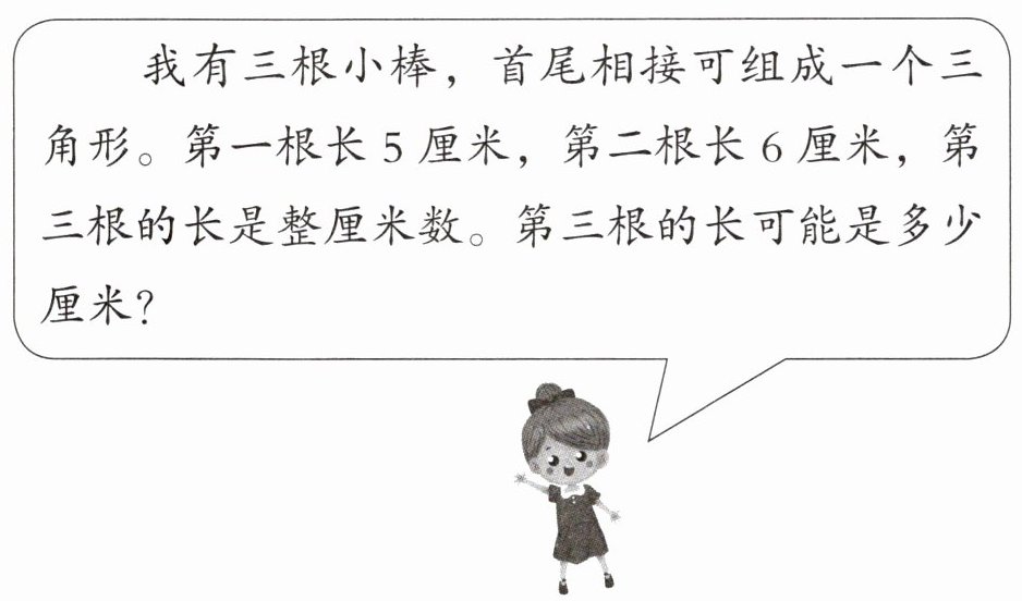 答:第三根小棒的长可能是2厘米、3厘米、4厘米、5厘米、6厘米、7厘米、8厘米、9厘米、10厘米。