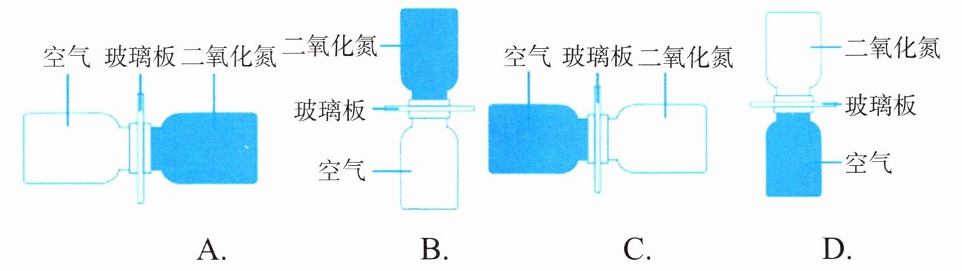 11.科学研究中,实验设计的严密性是获得正确结论的前提。下列四种设计(图中透明瓶内是空气,深色瓶内是二氧化氮),抽出玻璃板后,都能观察到密度比空气大的二氧化氮气体进入空气中,但其中不能说明二氧化氮分子处于不停运动的是(