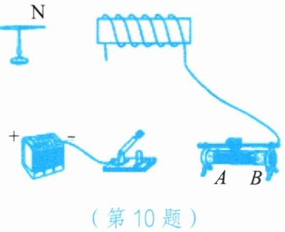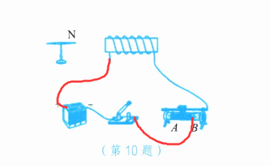 10. 请用笔画线代替导线,将下页图所示的实物图补充完整。要求:①小磁针的指向满足图示方向;②滑动变阻器的滑片向A端移动后,通电螺线管的磁性减弱;③原有导线不得更改。