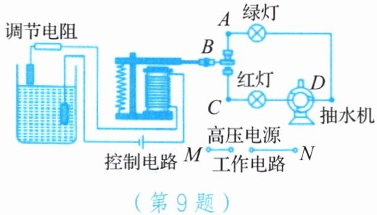 9. 由于暴雨所造成的城市内涝给人们生活带来很大影响。小明设计了一种利用电磁继电器来自动控制抽水机工作的电路:当水位在安全位置以下时,绿灯亮,抽水机不工作;当水位到达安全位置上限时,红灯亮,抽水机开始工作。上图是小明还未连接完成的电路,小明接下去的电路连接应该是(