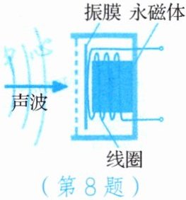 8. 右图是动圈式话筒的部分结构。声波使振膜左右振动,连接在振膜上的线圈也随之振动,切割永磁体的磁感线产生电流,此过程中(