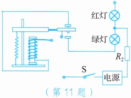 11. 下图是小敏设计的一个红、绿两灯能交替发光的电路。请将未完成的电路补充完整。