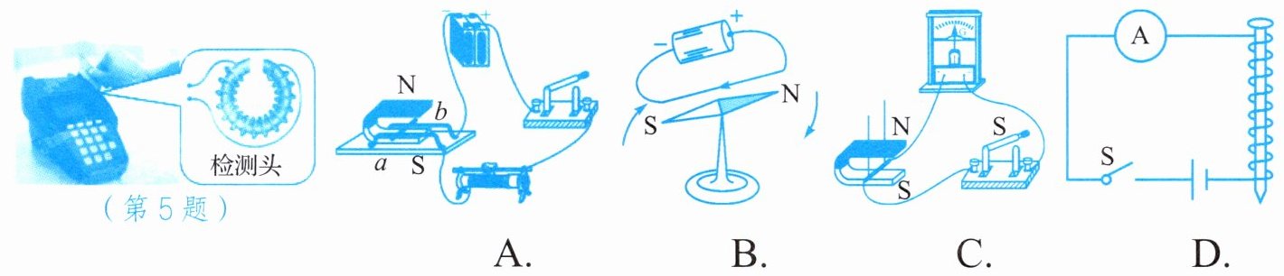 5. POS刷卡机的广泛应用给人们的生活带来了便利。在POS机的刷卡位置,有一个由绕有线圈的小铁环制成的检测头(如下页图所示)。在使用时,将带有磁条的信用卡在POS机指定位置刷一下,检测头的线圈中就会产生变化的电流,POS机便可读出磁条上的信息。图中能反映POS刷卡机读取信息原理的是(