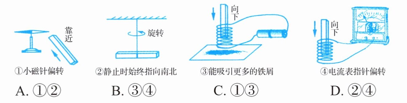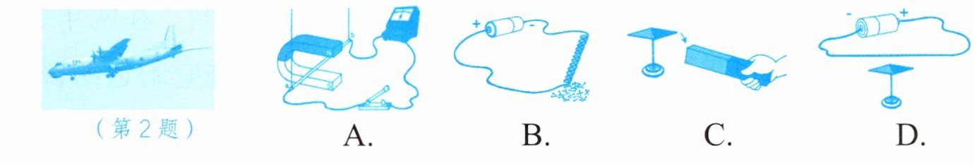 2. 下图所示为我国新型反潜巡逻机,机尾的“棍子”叫做磁异探测器,它能将潜艇经过海域引起的磁场强弱变化转化为相应电流的变化,从而发现潜艇的存在。下图中能解释磁异探测器工作原理的是(