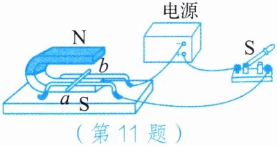 11. 右图为“探究磁场对通电导线的作用”的实验装置,当闭合开关S时,导线ab中自由电子定向移动的方向是
