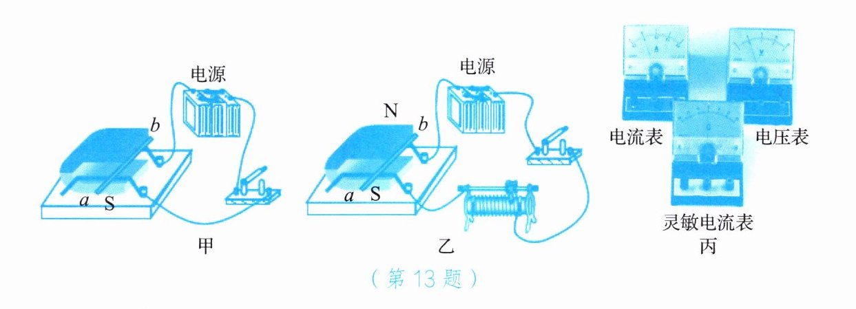 13. 如下页图所示,图甲是“探究磁场对通电导线的作用”的实验装置图,小科同学实际探究时,在电路上连接了一个滑动变阻器,如图乙所示,实验记录如下页表所示: