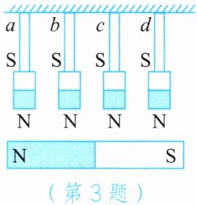 3. 如图所示,四根相同的橡皮筋下挂着等质量的小条形磁铁(橡皮筋在弹性范围内,磁铁间不会吸在一起),橡皮筋被拉得最长的是(