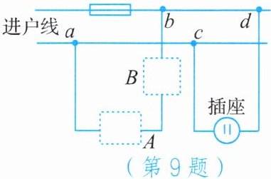 9. 小明想在家里安装一盏照明灯,如图所示是他设计的电路,请你帮他在图中的虚线框内分别接入开关和电灯:A处接