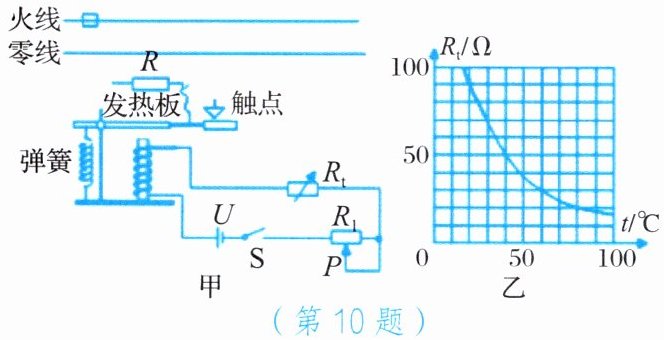 10. 某兴趣小组的同学设计了如图甲所示的恒温水箱温控电路,由工作电路和控制电路组成。工作电路主要元件为一块发热板R,工作时接通,不工作时断开;控制电路中电源电压U恒为30V,热敏电阻$R_{t}$作为感应器探测水温,置于恒温水箱内,其阻值随温度变化的关系如图乙所示,滑动变阻器$R_{1}$上标有"300Ω 1A"的字样,可以调节水箱的最高控制温度。闭合开关S,当通过电磁铁线圈的电流不小于100mA时,衔铁会被吸下,停止加热。(不计继电器线圈的电阻)