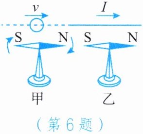 6. 如图甲所示,电子沿着水平方向平行飞过小磁针正上方时,小磁针的N极向纸外发生偏转。将一根通电直导线放在小磁针正上方或正下方,如图乙所示(图中只画出了通电直导线放在小磁针正上方的情况)。请你根据图甲的实验现象,分析图乙的情况,下列说法正确的是(不考虑地磁场的影响)(