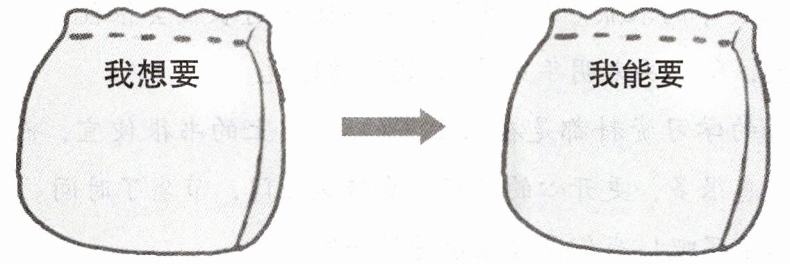 在日常生活中,琳琅满目的商品总会吸引我们的眼球。请你先在左边的口袋中写一写你想要的商品,再根据家庭的实际情况,从合理消费的角度筛选一下,看看你能要的商品有哪些,并写在右边的口袋中。