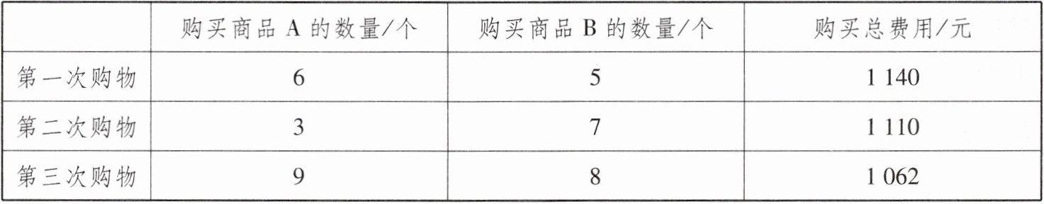 1. 小林在某商店购买商品 A,B 共三次,只有一次购买时,商品同时打折,其余两次均按标价购买,三次购买商品 A,B 的数量和费用如下表: