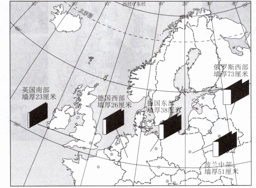 (1)英国南部至俄罗斯西部,传统民居墙壁的厚度逐渐____