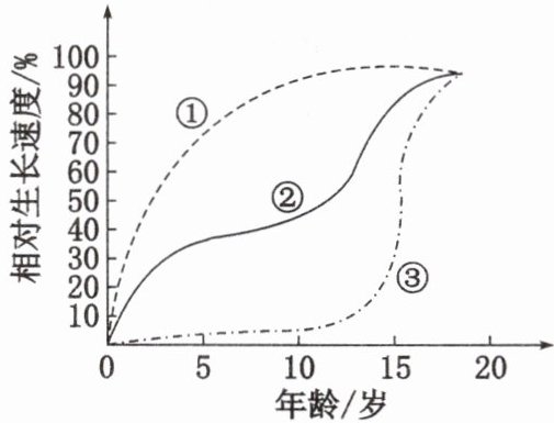 5. 人的生长发育是一个连续的过程,但不同部位的生长发育时间有一定差异,图示为人体大脑、整个身体和生殖器官的生长速度曲线图,下列有关叙述错误的是(