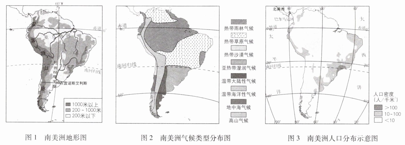 某中学地理兴趣小组根据搜集的南美洲地形图(图1)、南美洲气候类型分布图(图2)、南美洲人口分布示意图(图3),运用区域地理学习的方法,探究南美洲的地理位置和地理特征。请帮助该小组完成相关探究任务。